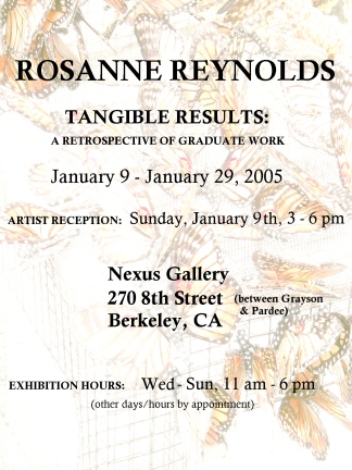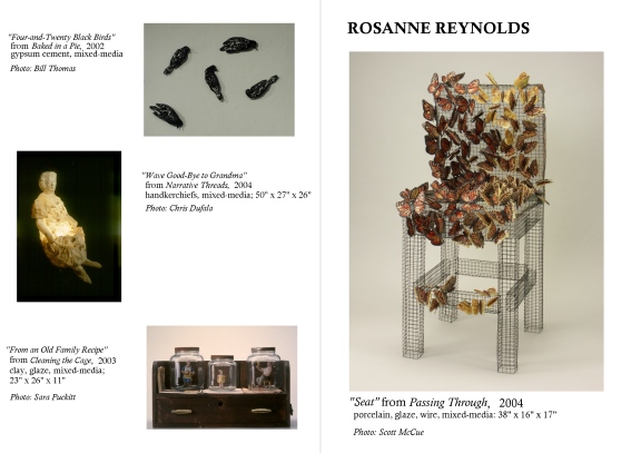 Works included in the exhibition are installations from three different shows created and shown by Reynolds during her MFA study 2002 – 2004 at San Jose State University: Baked in a Pie, Cleaning the Cage, and Narrative Threads, as well as a preview of her thesis show: Passing Through.